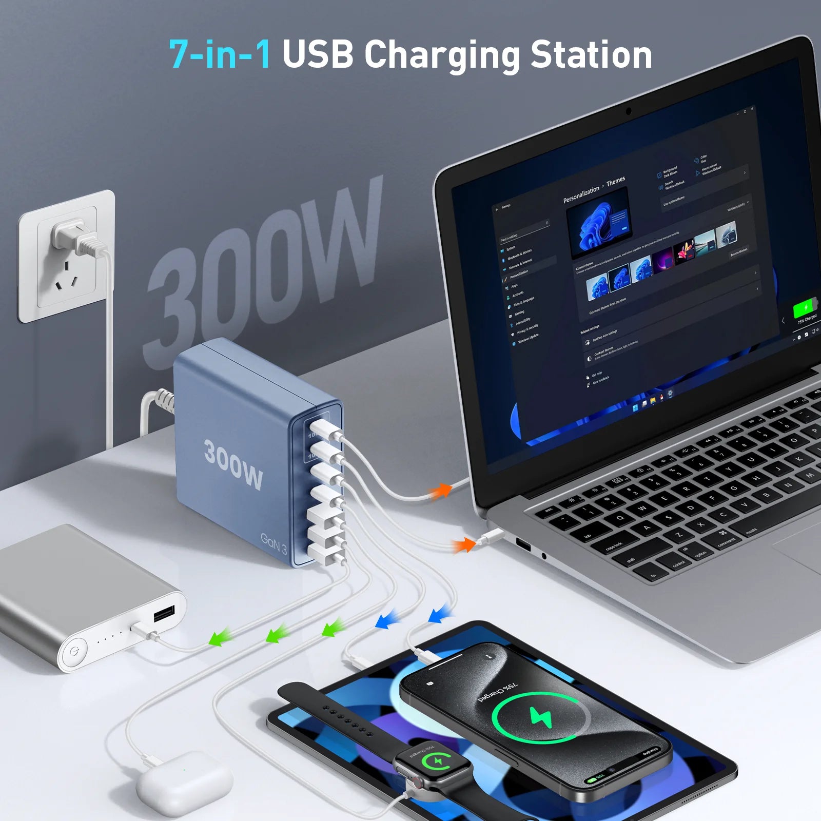 - 300W total power distributed across 7 ports, enabling fast charging for laptops, phones, tablets, and accessories at the same time.