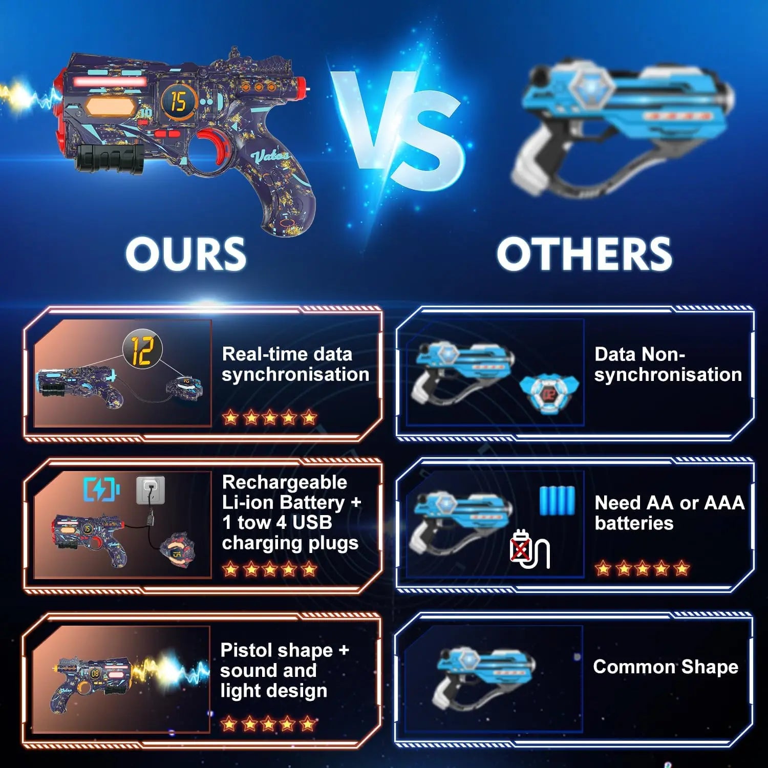 This laser tag gun set stands out from typical offerings in the market with its innovative design and functionality. Unlike conventional sets, the Vatos system allows for seamless data syncing and features vibrant glowing lights that create an electrifying atmosphere during gameplay.